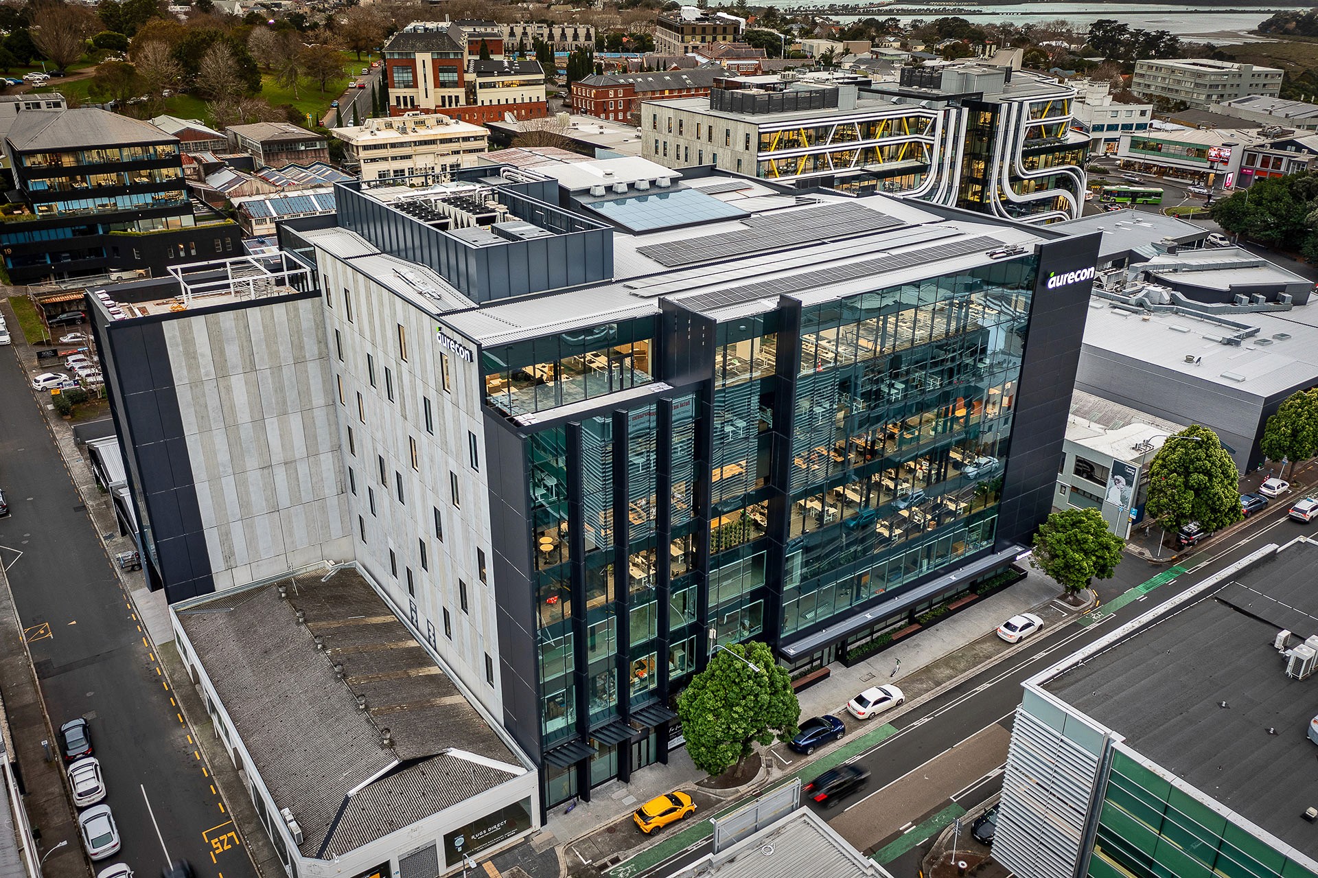 KFI delivered the complete façade package for 110 Carlton Gore Road, a premium six-level office and retail development in Auckland’s Newmarket precinct. The façade incorporates a high-performance 200 mm unitised curtain wall system with full-height glazing, aluminium feature fins, roof glazing, internal extrusion fins, and external aluminium cladding.