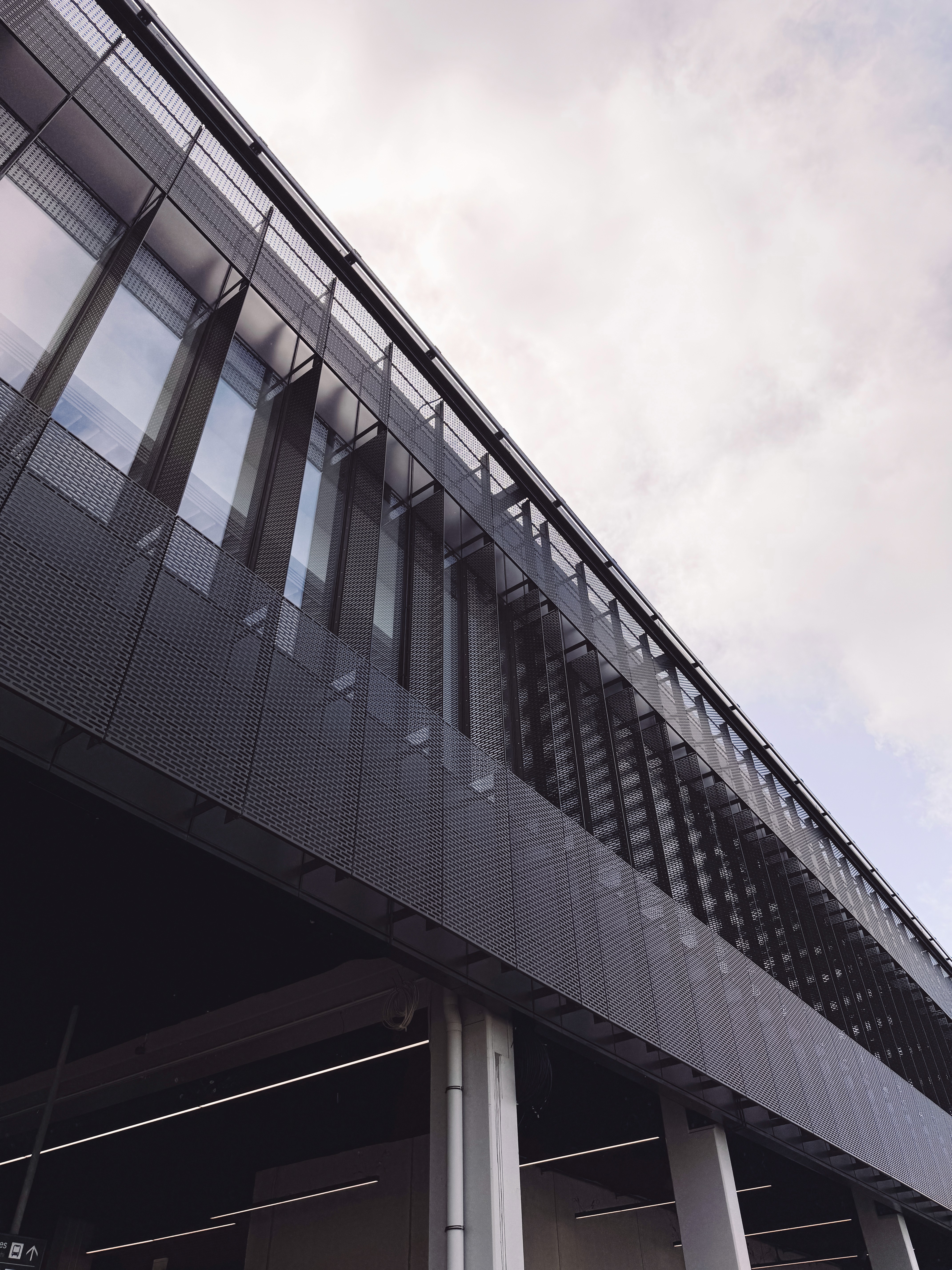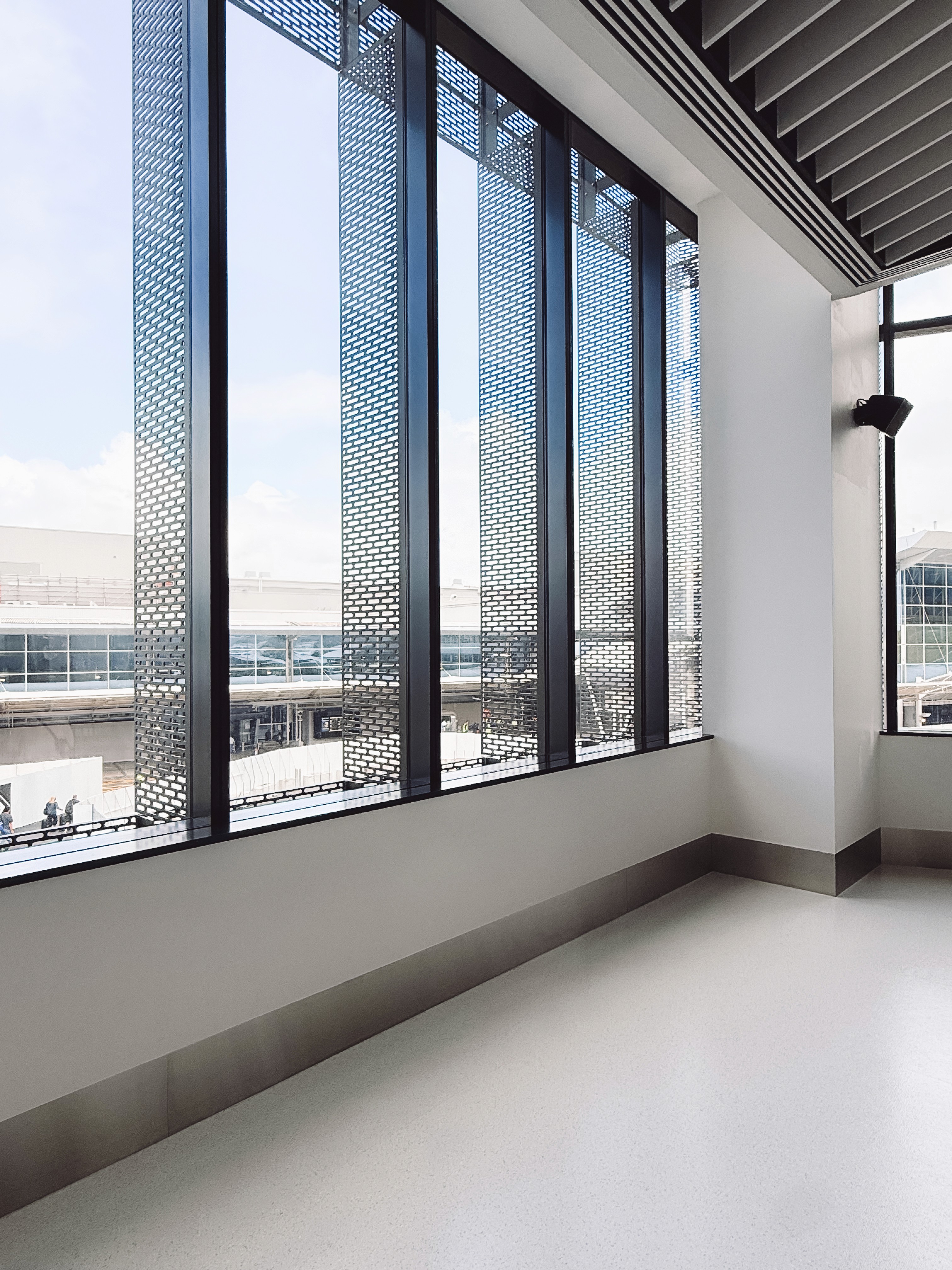 The design underwent wind tunnel testing to ensure performance in high wind zones. The perforated panels provide shading, ventilation, and visual interest with minimal maintenance. Adjacent office façades continue the language using vertically oriented fins for daylight control and aesthetic continuity.