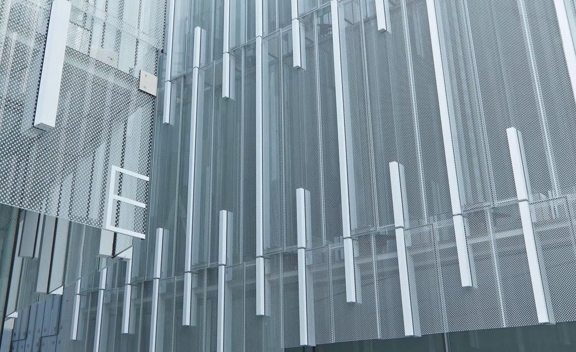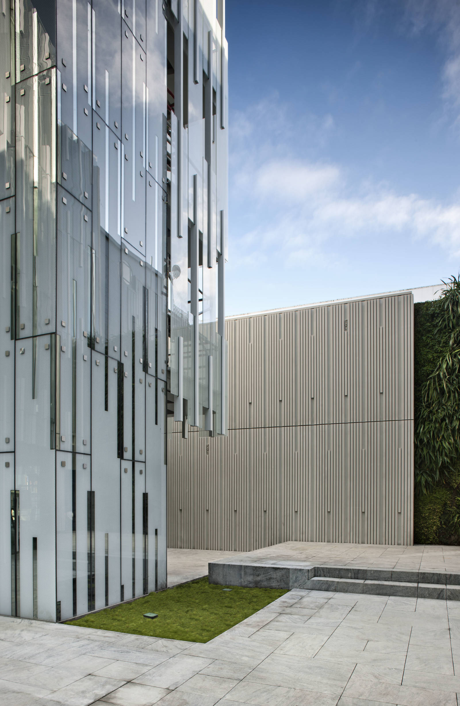 The façade consists of a frameless twin-skin system, with internal laminated low-E glass and top-hung manual sliding doors supported by laminated glass fins. The operable outer skin comprises fixed and pivoting frameless glass panels that are electronically controlled to regulate airflow and temperature within the cavity.