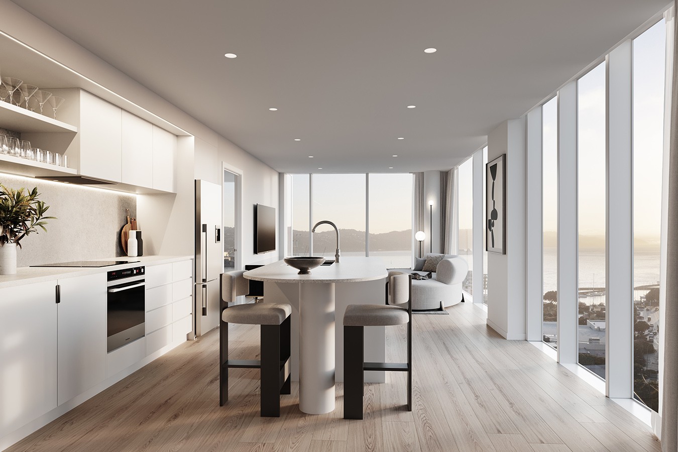The façade features a high-performance 180mm thermally broken curtain wall system and 134 thermally broken sliding doors, providing energy efficiency and acoustic comfort for all apartments. Externally, extruded aluminium plank cladding is used extensively across balcony soffits and upper levels to enhance material depth and durability. Balustrades are finished with a custom glass system to maintain clean lines and visual transparency, while vertical aluminium louvre fins provide solar shading and architectural articulation.